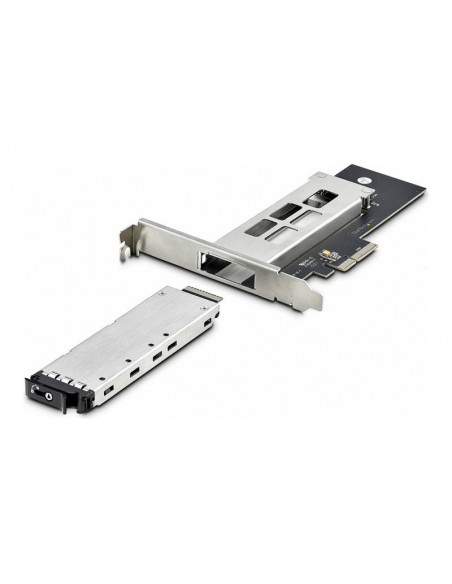 Descrição do produto: StarTech.com M.2 NVMe SSD to PCIe x4 Mobile Rack/Backplane with Removable Tray for PCI Express Expansion Slot, Tool-less Installation, PCIe 4.0/3.0 Hot-Swap Drive Bay, Key Lock - 2 Keys Included - adaptador de interface - M.2 NVMe Card / PCIe 4.0 (NVMe) - PCIe 4.0 x4; Tipo de dispositivo: Adaptador de interface - cartão plug-in; Tipo de Bus: PCIe 4.0 x4; Cor: Preto, prata; Baias para dispositivos: 1 x interno - M.2 2230/2242/2260/2280; Compatibilidade de Factor de Forma de Disco Rígido: M.2; Interface: M.2 NVMe Card / PCIe 4.0 (NVMe); Taxa de transferência de dados: 64 Gbit/s; Tipo de dispositivo suportado: Unidade de disco de estado sólido; Quantidade máxima de armazenagem de dispositivos: 1; Material do produto: Stainless steel; Dimensões (LxPxA): 1.9 cm x 16.7 cm x 12 cm; Peso: 65 g; Garantia do fabricante: Garantia de 2 anos; Projetado para: StarTech.com Expansion Slot Rear Exhaust Cooling Fan with LP4 Connector (FANCASE);
