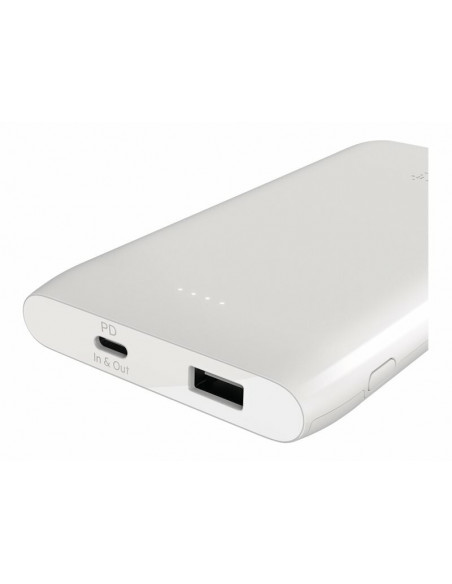 Power bank Belkin BOOST?CHARGE com capacidade de 10000mAh e suporte a Power Delivery de 18W para carregamento rápido. Design compacto e elegante em branco, com duas saídas USB (uma Tipo-C e uma Tipo-A). Inclui cabo USB-C.