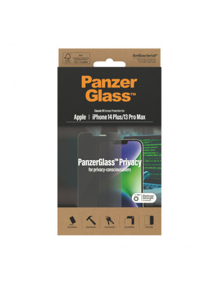 PanzerGlass Classic Fit Privacy Apple i. Marca compatible: Apple, Compatibilidad: Apple - iPhone 14 Plus, Apple - iPhone 13 Pro Max, Funciones de protección: Resistente a rayones, Resistente a golpes, Antibacteriano. Función de filtrado de privacidad, Material: Vidrio templado, Tereftalato de polietileno (PET), Color del producto: Transparente. Cantidad por paquete: 1 pieza(s)