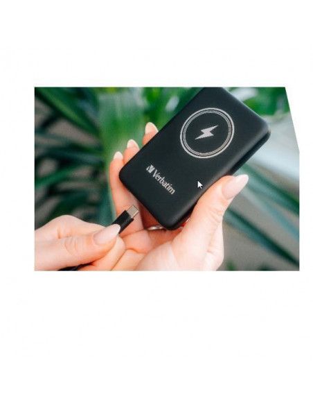 Power Bank Verbatim 32240 com 5000mAh, carga sem fio magnética e conectores USB-C e USB-A. Design compacto e recarga rápida. Ideal para carregar dispositivos móveis em qualquer lugar.