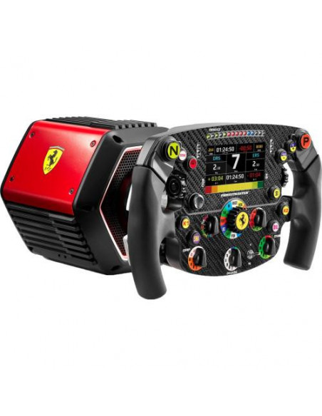 A réplica oficial do volante da Ferrari SF1000, em escala 1:1, com painel frontal em fibra de carbono, acrescenta autenticidade e luxo. O ecrã LCD IPS de 4,3 polegadas mostra até 69 dados de telemetria (dependendo do jogo), e 21 LEDs indicam a velocidade do motor e bandeiras da FIA. O anel de LED RGB personalizável adiciona um toque visual dinâmico.