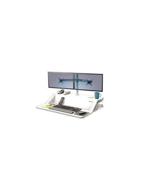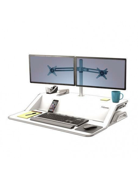 Suporte para monitor duplo Fellowes 8042901, na cor prateada, feito de aço. Ideal para estações de trabalho Lotus?, este suporte permite uma organização eficiente do espaço de trabalho.