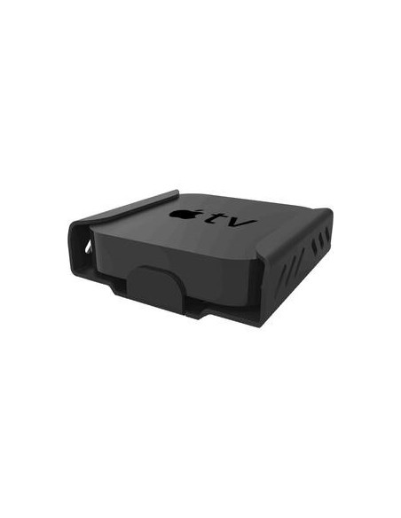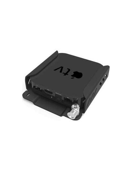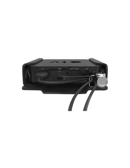 Suporte de montagem Compulocks para TV, na cor preta.  Permite fixar a sua Apple TV de forma segura em várias superfícies.  Design ventilado e acesso completo às portas.  Inclui suporte de montagem, trava de segurança e chaves.