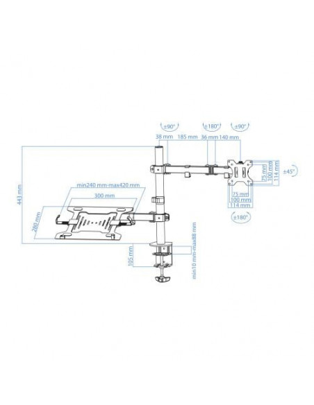 O suporte de mesa Tooq DB1200TN-B oferece uma solução ergonómica e prática para organizar o seu espaço de trabalho.  Compatível com monitores de 13 a 32 polegadas (33cm a 81,3cm) e portáteis, este suporte permite ajustar a altura, a inclinação e a rotação do seu ecrã, proporcionando uma posição de trabalho mais confortável e produtiva.  A inclinação é ajustável entre -45° e 45°, a rotação entre -90° e 90°, e o ângulo de giro até 180°.  O suporte é regulável manualmente em altura.  O suporte é compatível com padrões VESA de 75x75mm e 100x100mm.  A capacidade máxima de peso é de 12,5kg (8kg por ecrã). É compatível com espessuras de mesa de 1cm a 8,8cm. O suporte é robusto e feito de materiais de alta qualidade para garantir estabilidade e durabilidade. O design elegante em preto combina com qualquer ambiente de trabalho. O suporte é montado através de uma abraçadeira ou parafusos. O peso do suporte é de 6,32kg. O pacote pesa 660g e tem dimensões de 465mm x 116mm x 295mm.