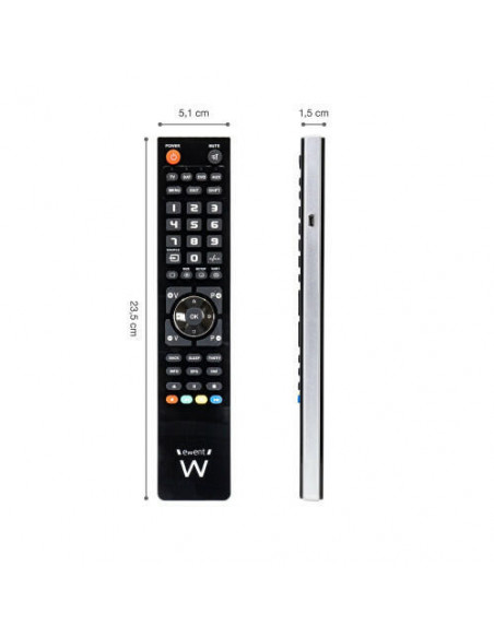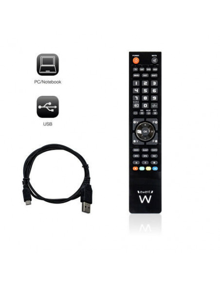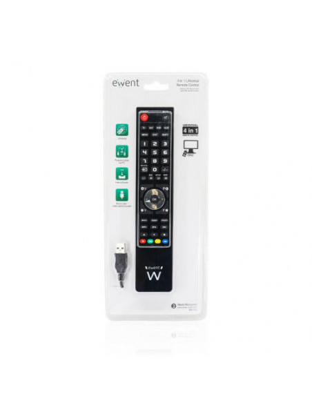 ¿Desea cambiar el mando a distancia de su televisor o desea utilizar un único mando para controlar 4 dispositivos de A/V? El mando a distancia universal EW1570 4 en 1 se ha diseñado para controlar 4 dispositivos AV diferentes con un único mando. Puede utilizarlo con dispositivos TV/DTT/SAT /STB/DVD/VCR/Blu-ray/Proyectores/Barra de sonido/Disco duro multimedia/Hi-Fi Programe el mando a distancia universal EW1570 4 en 1 con gran facilidad mediante su ordenador con Windows, utilizando el cable micro USB a USB proporcionado. El mando incluye todas las funciones del mando a distancia original gracias a la asignación de teclas individuales La memoria permanente del mando a distancia guarda los códigos durante el reemplazo de las pilas.
