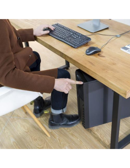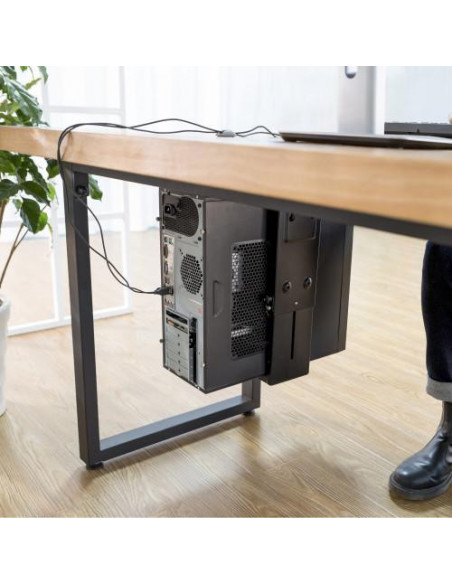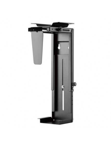 Suporte para CPU Ewent EW1293, de metal, para instalação sob a mesa. Ajustável em altura e largura, permitindo uma melhor organização do espaço de trabalho. Suporta até 10kg e permite rotação de 360°. Design em preto, robusto e funcional. Uma solução ideal para quem procura otimizar o espaço na secretária, mantendo o computador organizado e protegido.