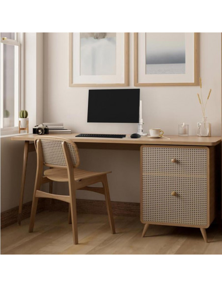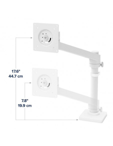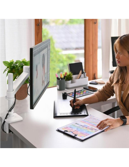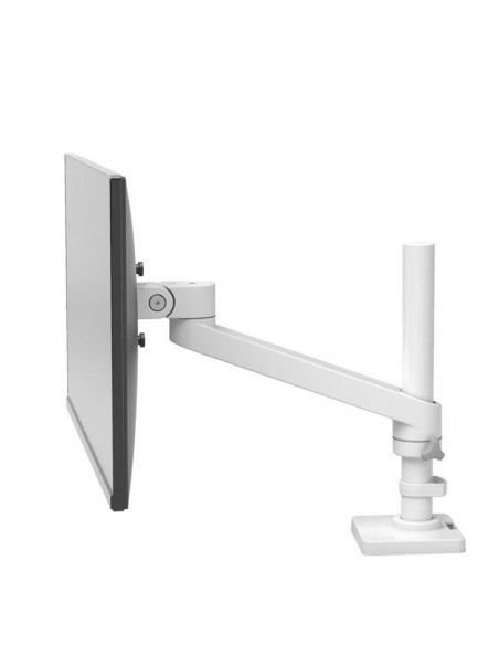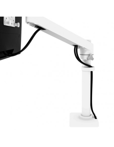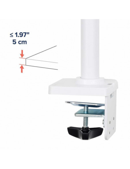 Este suporte permite inclinação de +30º a -5º, rotação de ±360º e giro de ±180º, oferecendo flexibilidade total para adaptar a posição do seu monitor às suas necessidades. A sua estrutura de braço articulado permite a gestão eficiente de cabos, mantendo a sua secretária organizada. O design elegante e moderno na cor branca integra-se facilmente em qualquer ambiente de trabalho.