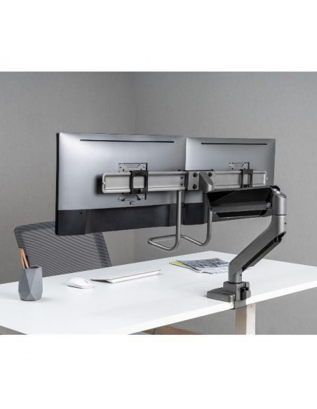 O suporte de mesa EQUIP para dois monitores é uma solução prática e eficiente para quem procura otimizar o espaço de trabalho e melhorar a ergonomia. Este suporte permite a instalação de dois monitores com dimensões até 32 polegadas e um peso máximo de 9 kg cada, criando uma configuração dupla de ecrãs para uma experiência de trabalho mais imersiva e produtiva. A instalação é simples e segura, graças à sua compatibilidade com os padrões VESA 75x75mm e 100x100mm, amplamente utilizados na maioria dos monitores atuais. Esta compatibilidade garante a adaptação a uma grande variedade de modelos de monitores no mercado.