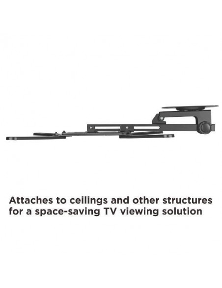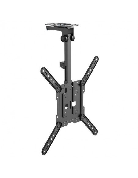 Suporte de teto EQUIP Ergo para ecrãs LED/LCD com tamanhos entre 23" e 55". Este suporte de cor preta permite uma instalação no teto, oferecendo flexibilidade e poupança de espaço. Compatível com diversos padrões VESA, suporta até 20kg e inclui sistema de gestão de cabos.