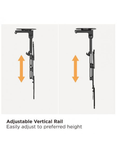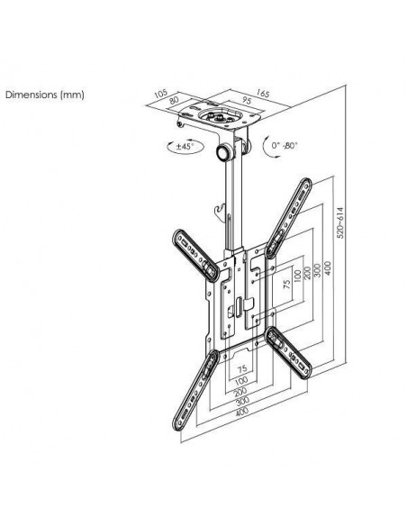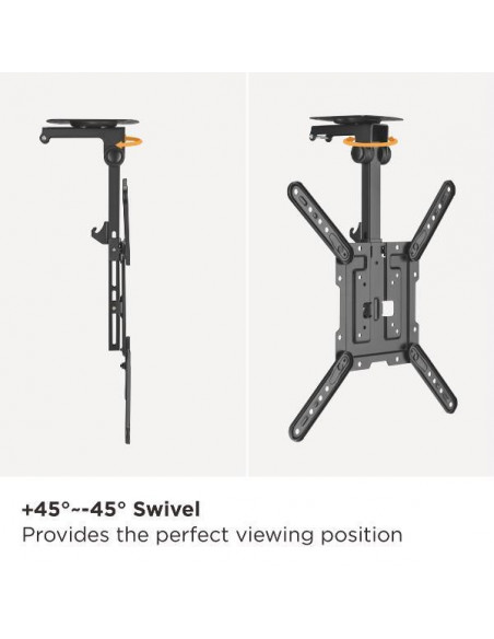 A instalação no teto é facilitada pelas instruções claras e os kits de parafusos incluídos. O suporte oferece ajustes de inclinação (0° a -80°) e rotação (+45° a -45°), permitindo encontrar o ângulo de visualização perfeito. A distância até à parede é de 83mm.