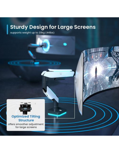 O suporte para monitor Ewent EW1509 é uma solução versátil e elegante para monitores de até 49 polegadas (124,5 cm), com capacidade de carga até 20 kg. Compatível com monitores curvos e planos, este suporte permite ajuste de altura, inclinação (-20° a +50°), rotação (360°) e pivô (-90° a +90°), oferecendo uma experiência de visualização personalizada e ergonómica. O design inclui iluminação RGB com 7 efeitos dinâmicos. Inclui gestão de cabos. Ideal para escritórios e gaming. Características principais: