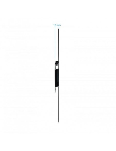 Para uma instalação limpa e sem obstruções, o suporte apresenta uma distância mínima à parede de apenas 12mm. O seu design discreto e minimalista, na cor preta, integra-se facilmente em qualquer ambiente. A embalagem inclui o suporte, o manual de instalação e o kit de montagem necessário. A instalação é simples e intuitiva, facilitando a colocação do ecrã na parede de forma rápida e segura.