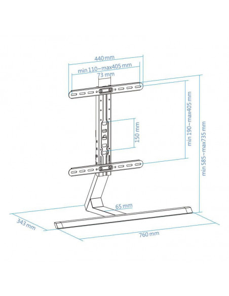 Um detalhe importante é a compatibilidade com ecrãs curvos, abrangendo uma variedade de formatos de tela. A altura ajustável (735-585 mm) permite encontrar a posição de visualização ideal, adaptando-se às preferências pessoais e às condições do espaço. O suporte apresenta dimensões de base de 760x343 mm, oferecendo uma base sólida e estável para sua televisão.