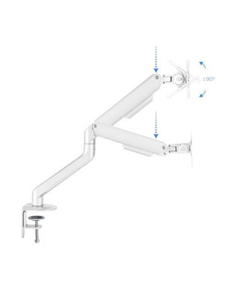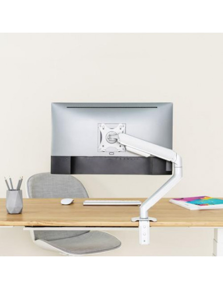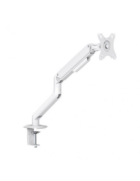 A gestão de cabos integrada ajuda a manter a sua área de trabalho organizada e livre de fios emaranhados, contribuindo para uma estética mais limpa. O sistema de montagem é flexível, permitindo a fixação na mesa através de uma abraçadeira ou com parafusos, adaptando-se a diferentes tipos de mesas e espessuras (mínimo 1cm, máximo 8cm). O suporte é compatível com padrões de montagem VESA de 75x75mm e 100x100mm. A cor branca confere um toque de elegância ao seu espaço de trabalho. Este suporte é construído com materiais robustos e de qualidade, garantindo estabilidade e durabilidade.