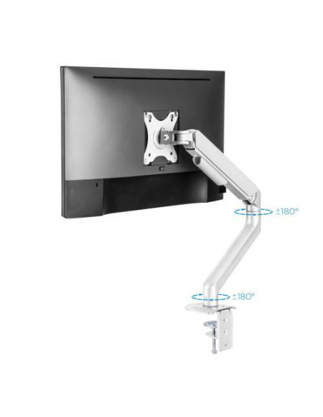 O suporte para monitor Tooq DB4032TNR-W é compatível com ecrãs de 17" a 32" (43,2 cm a 81,3 cm). Oferece ajuste de altura (133-428mm), inclinação (-55° a +55°), rotação (180°) e pivotação (180°). Suporta até 9kg e inclui gestão de cabos. A instalação é feita por abraçadeira ou parafuso. Disponível em branco.