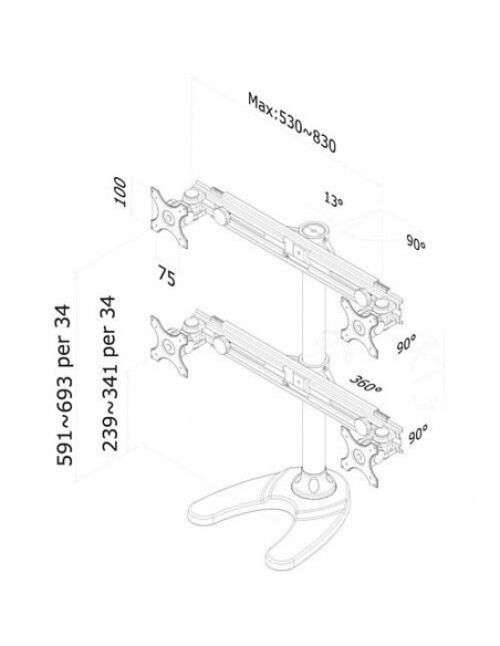 Com uma capacidade de carga máxima de 15 kg, distribuída entre os quatro monitores, este suporte garante a estabilidade mesmo com monitores de maior dimensão. A compatibilidade com monitores até 27 polegadas (65 cm) e com padrão VESA 75x75 ou 100x100 mm, garante a sua adaptação a uma vasta gama de equipamentos.