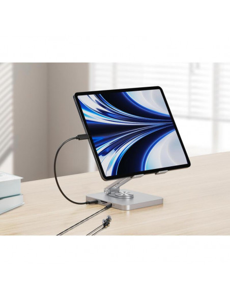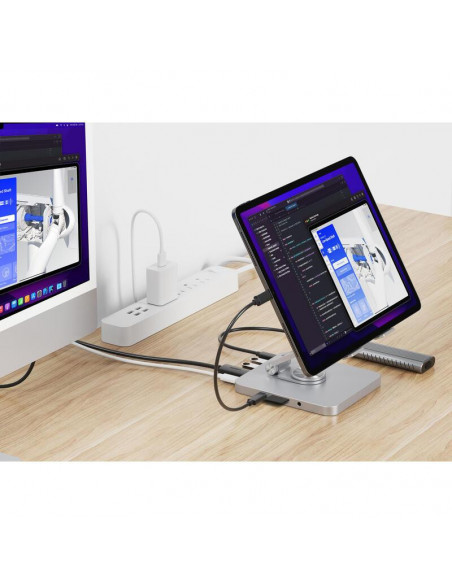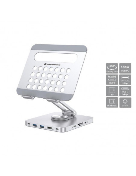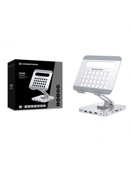 Esta docking station portátil Conceptronic DONN26G oferece uma solução versátil para ligação de múltiplos dispositivos ao seu portátil ou tablet. Com ajuste de altura e ângulo para uma posição ergonómica ideal, a base rotativa a 360º garante flexibilidade. Suporta resoluções HDMI até 4K a 60Hz e entrega de energia USB (PD) até 100W. Inclui duas portas USB-A e uma USB-C (5Gbps), leitor de cartões SD 3.0 e MicroSD/TF 3.0, e entrada de áudio combo de 3,5mm. Compatível com Windows, macOS e ChromeOS, a instalação é simples (plug and play). A sua caixa de alumínio garante dissipação de calor eficiente. Inclui cabo USB-C para USB-C de 40cm e 100W.