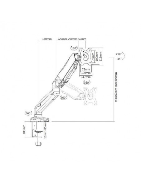 Compatível com padrões VESA 75x75mm e 100x100mm, o suporte adapta-se a uma variedade de monitores, simplificando a instalação. A sua cor preta integra-se discretamente em qualquer ambiente de trabalho ou doméstico. As dimensões compactas (Altura: 570 mm, Comprimento: 468 mm, Profundidade: 117 mm) tornam-no ideal para espaços com limitação de espaço. Com um peso de 1,97 kg, o suporte é facilmente instalado e movimentado.