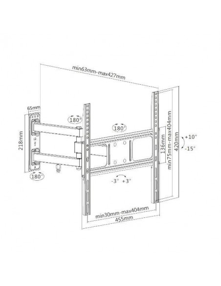 O suporte de parede articulado Equip, modelo 65034107101, oferece uma solução segura e prática para instalar televisores de 32 a 55 polegadas, com capacidade para até 35 kg. A sua flexibilidade permite ajustar a posição da televisão para uma visualização otimizada, graças ao sistema de duas articulações que proporciona uma ampla gama de movimentos, incluindo inclinação e rotação. A construção robusta em aço de alta resistência garante uma fixação segura e confiável. Com uma distância mínima à parede de 6,3 cm, o suporte mantém uma estética limpa e moderna. A instalação é simples e intuitiva. Para garantir a compatibilidade, verifique as especificações VESA do seu televisor. Este suporte é compatível com os padrões VESA: 200x200mm, 300x200mm, 300x300mm, 400x200mm, 400x300mm e 400x400mm. Dimensões: Altura: 427 mm, Comprimento: 455 mm, Profundidade: 420 mm, Peso: 2790 g. Mais informações podem ser encontradas em: [https://iland.sbs/DataSheets/?idarticolo=65034107101](https://iland.sbs/DataSheets/?idarticolo=65034107101)