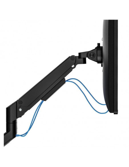 A gestão de cabos integrada contribui para uma arrumação limpa e organizada da sua mesa. O suporte é fabricado em alumínio, material robusto e elegante, com um design moderno em preto.