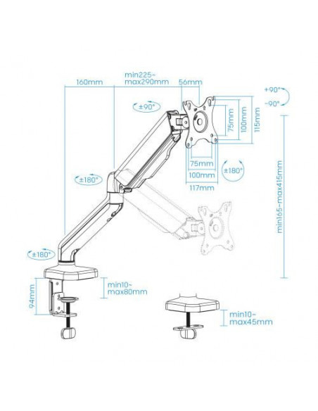 Ajuste de Altura, Inclinação e Rotação: O suporte permite um ajuste de altura entre 165mm e 415mm, permitindo encontrar a posição ideal para a sua postura. A inclinação pode ser ajustada entre -90° e 90°, e a rotação permite girar o ecrã em 180°, facilitando a partilha ou o trabalho colaborativo. O sistema de ajuste de altura é feito por meio de um amortecedor a gás, garantindo um movimento suave e fácil.