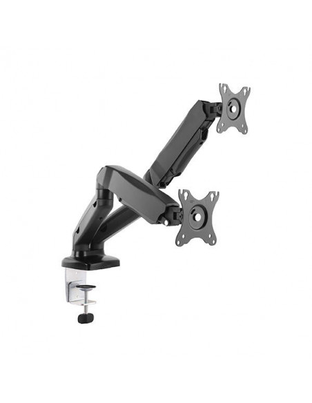 Suporte de secretária articulado Equip para dois monitores com dimensões entre 13" e 27". Suporta até 6,5kg de peso por monitor. Ajustável em inclinação, articulação e rotação. Compatível com padrão VESA 75x75 e 100x100.