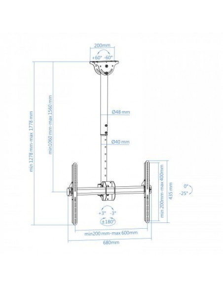 A versatilidade deste suporte é evidente nas suas opções de ajuste. Permite uma inclinação de +0° a -25°, rotação de +180° a -180° e nivelamento de +3° a -3°, permitindo ao utilizador encontrar o ângulo de visão perfeito. A distância ajustável do teto (1060-1560 mm) proporciona flexibilidade na instalação em diferentes tipos de espaços. É inclusive compatível com techos inclinados (+60°/-60°), expandindo as possibilidades de instalação.