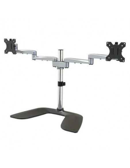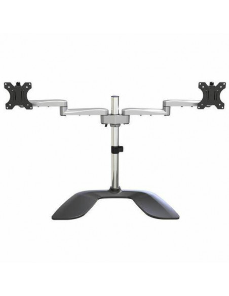 Suporte articulado para dois monitores da Startech, modelo ARMDUALSS, fabricado em metal e plástico, na cor cinzenta. Suporta até 8 kg e é adequado para monitores de até 32 polegadas. Inclui gestão de cabos. Embalagem unitária.