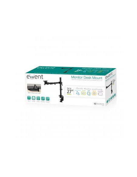 Su Ewent EW1512 tiene tres puntos de giro por monitor para establecer la distancia de visualización ideal. El soporte para escritorio de Ewent es adecuado para dos pantallas de hasta 27 pulgadas con un peso máximo de 8 kg cada una. Su EW1512 cuenta con un soporte VESA de 75x75 mm y 100x100 mm. El sistema de instalación sencillo posibilita el acoplamiento de dos monitores al soporte de escritorio sin que necesite ayuda de nadie. El soporte de escritorio Ewent cuenta con todo lo necesario para el montaje tanto para soporte de abrazadera como para soporte de ranura.