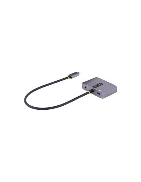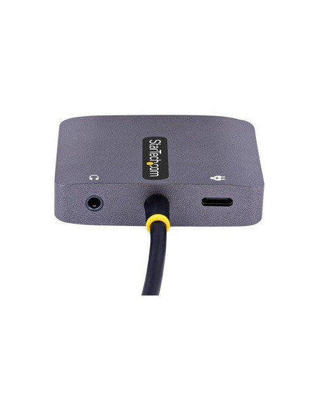 O Adaptador de Vídeo StarTech USB-C permite ligar o seu computador portátil a monitores HDMI ou VGA, suportando resoluções até 4K a 60Hz. Inclui saída de áudio de 3,5mm e passa-através USB Power Delivery (PD) de 100W. Compatível com Thunderbolt 3/4 e diversos fabricantes de portáteis.