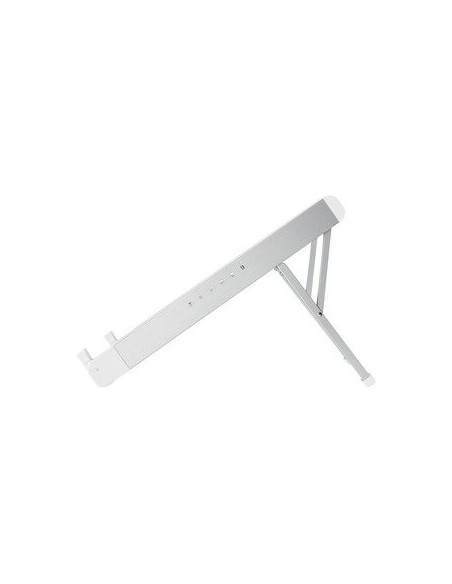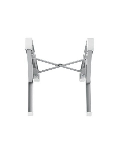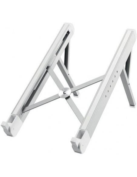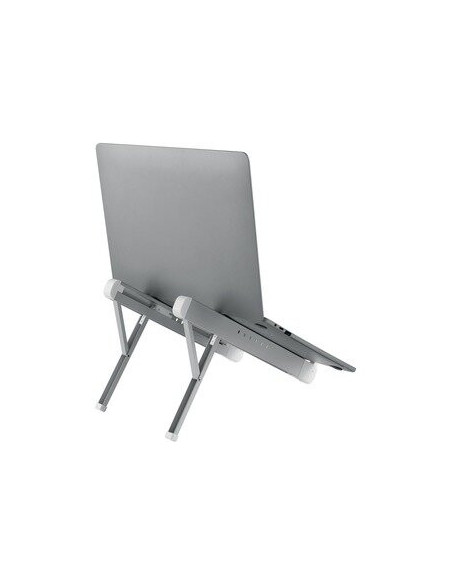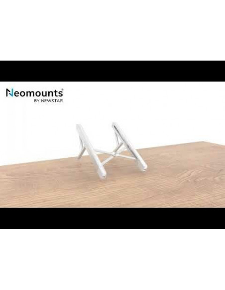 Suporte dobrável para portátil Neomounts Pro NSLS010, em prata, com design compacto e leve.  Ajustável em altura, ideal para melhorar a ergonomia e ventilação.  Suporta até 5 kg e ecrãs até 17 polegadas.