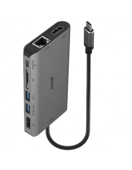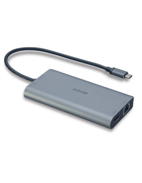 Mini estação de docking USB-C Lindy para expandir as portas do seu portátil. Permite ligação a um monitor 4K ou dois monitores Full HD, com carregamento pass-through de 100W. Construção em alumínio, cor cinzenta.