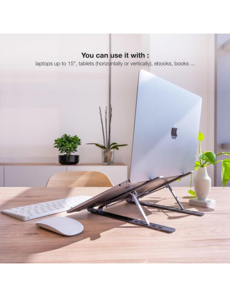 Uma das características mais destacadas do suporte Tooq é o seu sistema de ajuste de altura, com 7 níveis diferentes. Isso permite que personalize a altura do seu portátil para encontrar a posição ideal que se adapta à sua postura e ergonomia, reduzindo assim o risco de problemas de postura e fadiga. As almofadas de silicone integradas na superfície de apoio garantem uma proteção adicional ao seu portátil, evitando riscos e abrasões. Além disso, estas almofadas contribuem para a estabilidade do dispositivo.