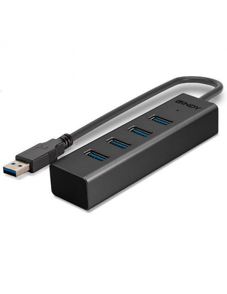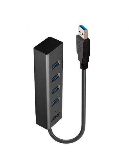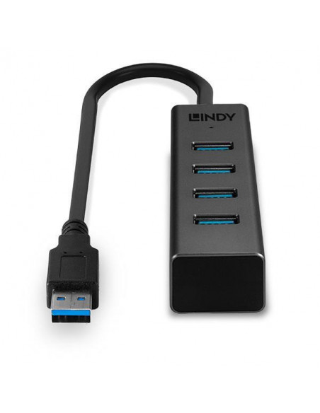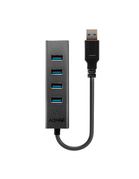 Concentrador USB 3.0 Lindy com 4 portas, design elegante em alumínio cinzento escuro. Expanda as portas USB do seu portátil.  Transferências de dados rápidas. Compacto e portátil.  Garantia de 36 meses.