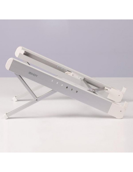 O Suporte para Portátil Dobrável Lindy proporciona uma solução elegante e prática para melhorar a ergonomia e o conforto ao trabalhar ou usar o seu computador portátil. Este suporte, construído em alumínio cinzento, oferece uma plataforma estável e segura para o seu dispositivo, permitindo uma posição de trabalho mais confortável e ergonómica, reduzindo o risco de dores nas costas, pescoço e ombros.