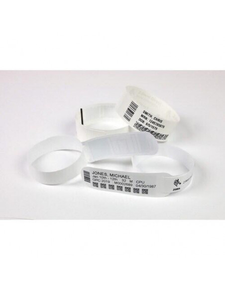 Pulseira de identificação Zebra Z-Band Splash, ideal para eventos e controle de acesso. Feita em polipropileno, é resistente à água e possui adesivo permanente. Cada caixa contém 6 rolos com 350 pulseiras cada.