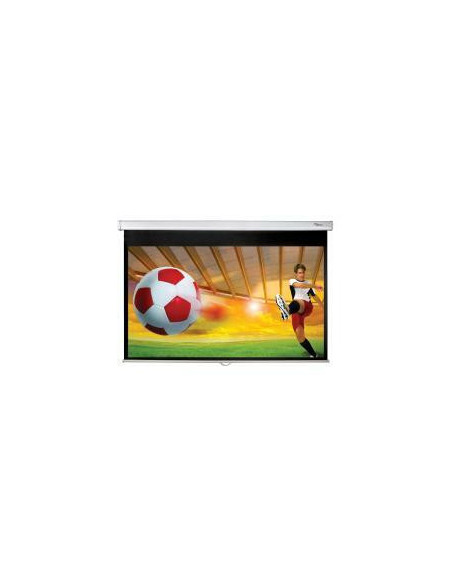 Ecrã manual Optoma DS-9092PWC, com 92 polegadas de diagonal e formato 16:9. Este ecrã de projeção frontal é ideal para home cinema, salas de conferências ou apresentações. Possui sistema de autobloqueio e um mecanismo de recolha controlado para evitar danos. A instalação pode ser feita na parede ou no teto. O ecrã é branco, com moldura preta de 4 cm. Peso: 11,3 kg.