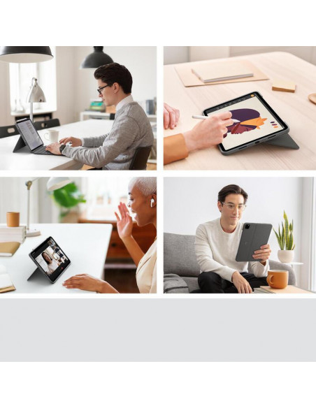 A capa inclui um suporte ajustável, permitindo ajustar o ângulo de visualização para otimizar a ergonomia e o conforto. O design fino e leve protege o seu tablet sem adicionar demasiado peso ou volume. A tecnologia Smart Connector garante uma conexão rápida e estável sem necessidade de emparelhamento Bluetooth, mantendo a bateria do iPadOS preservada. O Smart Connector também permite uma ligação firme e segura, protegendo o tablet contra quedas acidentais.