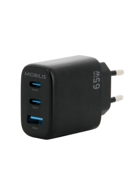 Carregador de parede Mobilis com três conectores USB. Compacto e prático, ideal para carregar tablets e outros dispositivos.