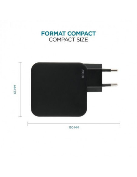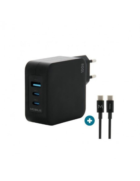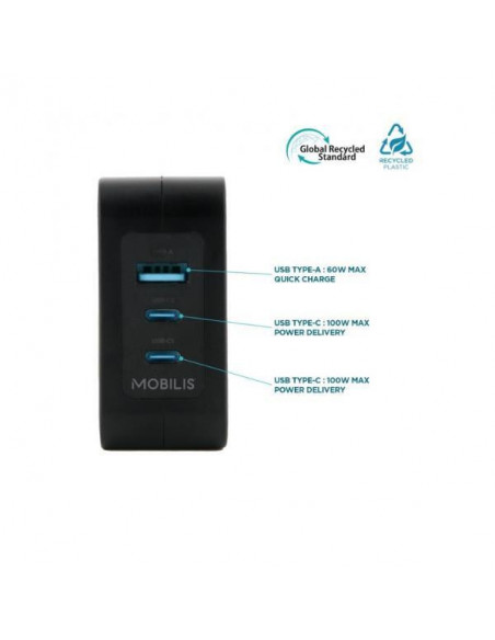 Carregador de rede Mobilis 001365, preto, com conectores USB-C, USB-A e USB.  286g.  Para informações completas, visite https://iland.sbs/DataSheets/?idarticolo=001365 ou contacte-nos.