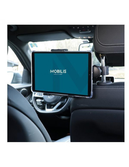 Suporte universal Mobilis para tablet, ideal para viagens de carro. Fixação no encosto de cabeça, compatível com a maioria dos tablets. Fabricado em plástico resistente, cor preta. Peso leve e instalação fácil. Garantia de 36 meses.