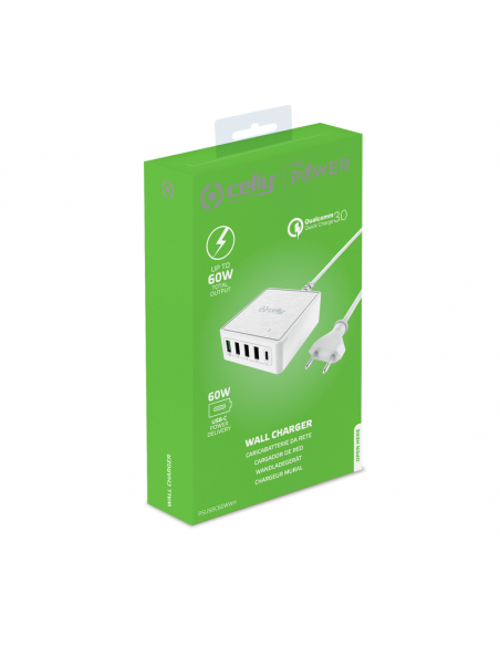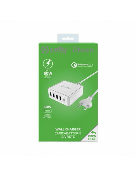 Carregador Celly de 60W com 5 portas USB, incluindo uma porta USB-C. Perfeito para carregar múltiplos dispositivos simultaneamente. Design compacto e eficiente, com cor branca.
