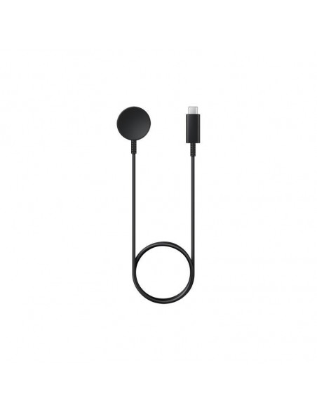 Carregador sem fios Samsung EP-OR900BBEGWW, compatível com vários modelos de relógios Galaxy Watch.  Oferece carga rápida e utiliza uma conexão USB-C.  Design compacto e elegante em preto.