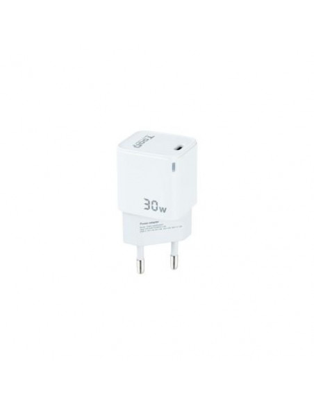 Este carregador de parede Tooq da gama GAN oferece uma potência de 30W através de uma porta USB-C com tecnologia Power Delivery (PD). Graças à tecnologia GaN (Nitreto de Gálio), é compacto e eficiente, dissipando menos calor. Ideal para carregar rapidamente smartphones e outros dispositivos compatíveis.