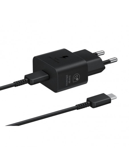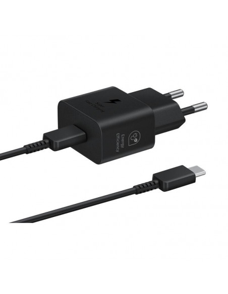 O carregador Samsung EP-T2510XBEGEU oferece carga rápida de 25W para dispositivos compatíveis com USB Tipo-C.  Com design compacto e tecnologia GaN, é eficiente e fácil de transportar. Inclui cabo USB-C de 1 metro. Preto.
