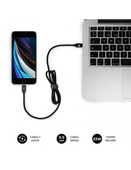 Carregador de parede SUBBLIM com dois puertos USB (USB-C e USB-A) para carregamento rápido de smartphones e tablets.  Oferece carregamento ultrarrápido até 25W com tecnologia Power Delivery e Quick Charge 3.0. Inclui cabo USB-C reversível de alta performance com adaptador Lightning.