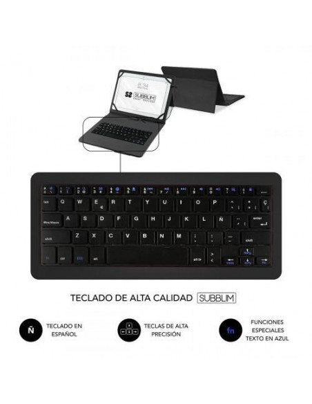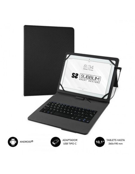 A capa com teclado Subblim Keytab Pro é uma solução prática para utilizadores de tablets Android com ecrãs entre 9 e 10 polegadas.  Com um design elegante em fibra de carbono, protege o seu tablet contra salpicos e danos diários. O teclado QWERTY, com teclas grandes e bem espaçadas, garante uma experiência de escrita confortável e eficiente. Inclui um suporte magnético que permite ajustar o ângulo do tablet idealmente para escrita ou visualização de vídeos.  A conectividade é assegurada através de Micro USB e USB-C (com adaptador incluído). O fecho magnético garante segurança e facilidade de transporte.