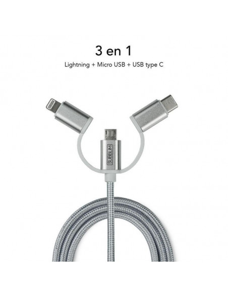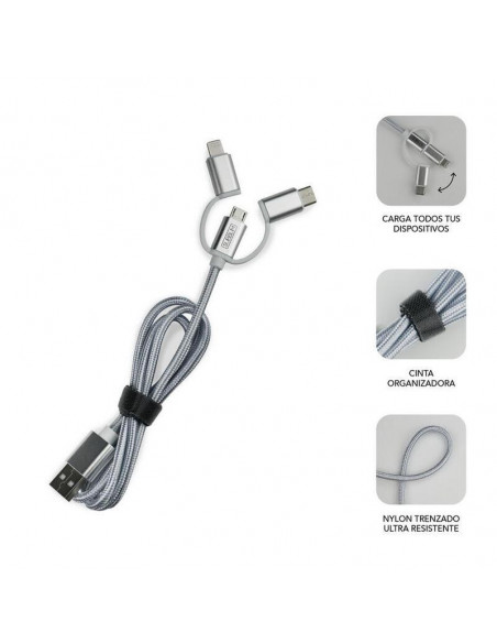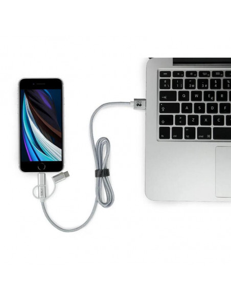 A versatilidade é assegurada pelo cabo USB 3 em 1 incluído. Este cabo apresenta três conectores diferentes (Lightning, Micro USB e USB Tipo C) num único cabo, eliminando a necessidade de ter vários cabos para diferentes dispositivos. O cabo é construído com uma capa exterior em fibra de nailon trançado duplo, que melhora a durabilidade e a flexibilidade, garantindo uma longa vida útil, mesmo com uso frequente. Para evitar emaranhados e facilitar a organização, inclui ainda uma correia de velcro.