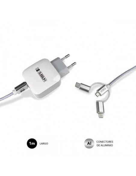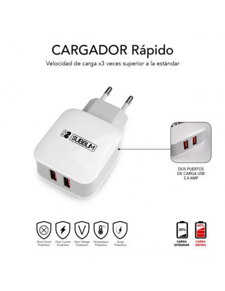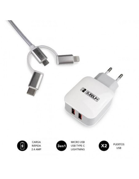 Carregador de parede/viagem Subblim com duas portas USB e uma corrente de saída total de 2.4A, permitindo carregar dois dispositivos simultaneamente. Inclui um cabo 3 em 1 (Micro USB, USB-C e Lightning) para maior comodidade. Ideal para smartphones, tablets e outros dispositivos. Fabricado em ABS, com proteção contra curto-circuito e sobreaquecimento.