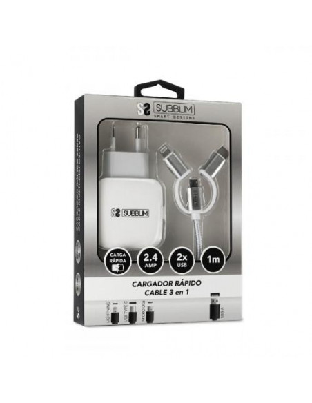 Acessório Subblim SUB-CHG-1ZWC01: Carregador USB Duplo (2.4A) + Cabo 3 em 1, Branco